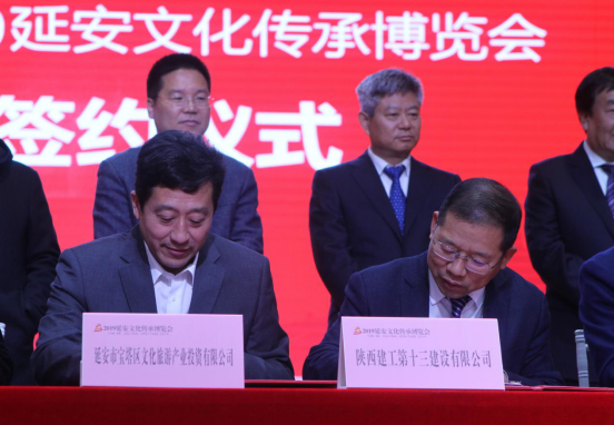 陜西建工第十三建設有限公司董事長(右)與延安市寶塔區(qū)文化旅游產(chǎn)業(yè)投資有限公司董事長米強(左)代表雙方簽約。