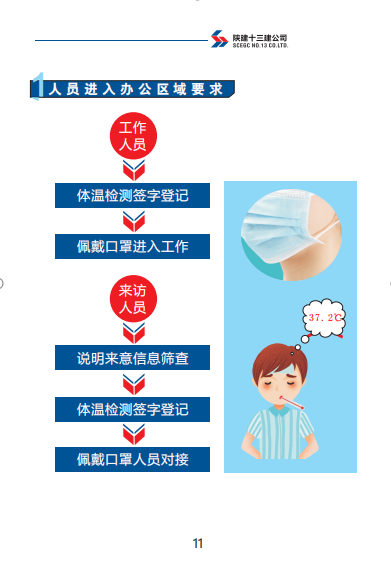 《手冊(cè)》包括陜建十三建公司復(fù)工準(zhǔn)備工作、復(fù)工前驗(yàn)收流程、辦公區(qū)管理、施工區(qū)管理、宿舍及餐廳管理、后勤保障、應(yīng)急管理七部分內(nèi)容。