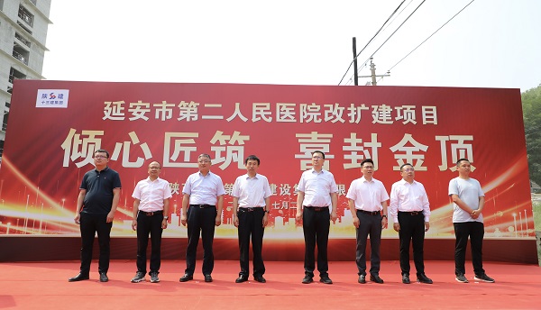 延安大學(xué)附屬醫(yī)院副院長祁軍利,延安市第二人民醫(yī)院院長武劍峰,延安城投集團(tuán)副總經(jīng)理劉靜,陜建十三建集團(tuán)副總經(jīng)理?xiàng)钣篮?、總工程師王弘起、副總?jīng)理張鑫偉,延安城投基建公司執(zhí)行董事趙明,中昕國際項(xiàng)目管理有限公司二院項(xiàng)目總監(jiān)白亮亮等出席封頂儀式。