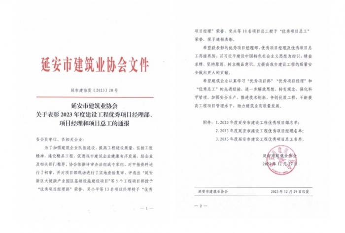 近日,延安市建筑業(yè)協(xié)會(huì)對(duì)2023年度建設(shè)工程優(yōu)秀項(xiàng)目經(jīng)理部、項(xiàng)目經(jīng)理、項(xiàng)目總工進(jìn)行了表彰。